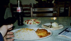 郵便局まで連れていってもらって、非常に助かった。AirMailを出して、少し裏道に入ってみるとguesthouseを発見。部屋を見せてもらうと、洗面所付き、トイレ・シャワーが別で50,000リアル。良くも悪くもないかもしれないが、部屋がきれいなのでここに決めた。隣接したレストランがあったので入ってみると、食べてみたかったモルグ(鳥)を発見。13:40、お腹いっぱいになって街中へ出かけることとした。