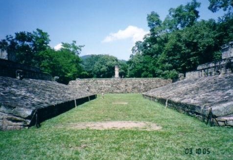 「コパン」。この旅は上野のマヤ文明展から始まった。グラン・プラザのステラAとB。5体のステラを建てたという第13代「18ウサギ王」という名前も面白い。(王名が、マヤ文字を使って、数字の18とウサギの絵で表される。)そして、独特な球戯場。展覧会では、捕虜が生死をかけて試合し、負けたら殺されると説明されていた場所だ。球戯場の奥には、古代マヤ文字解読を大きく前進させた「マヤ文字の階段」がステラMに並んでそびえ立っている。雨による浸食を防ぐためか、大きな仮設屋根で覆われている。